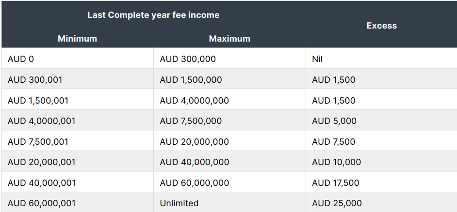 The applicable excesses under the cyber risk policy are based on each practice’s gross fee income for the last complete year, and range between $nil and $25,000, as shown here.